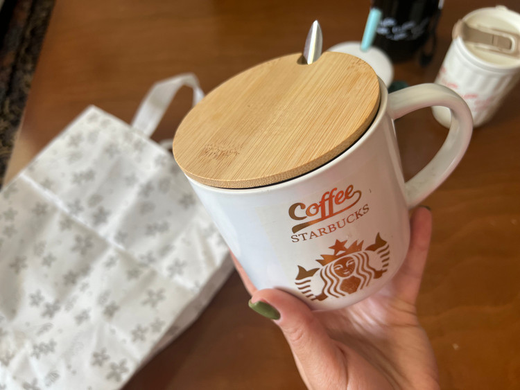 ماگ سرامیکی با درب بامبوو قاشق دار طرح استارباکس