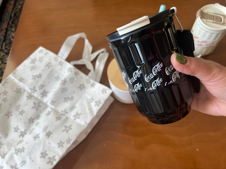 تراول ماگ درب دار نی دار و قفل شومدل coca coffee (رنگ کرم و مشکی) جنس بدنه داخل استیل بیرونی سرامیک نشکن
